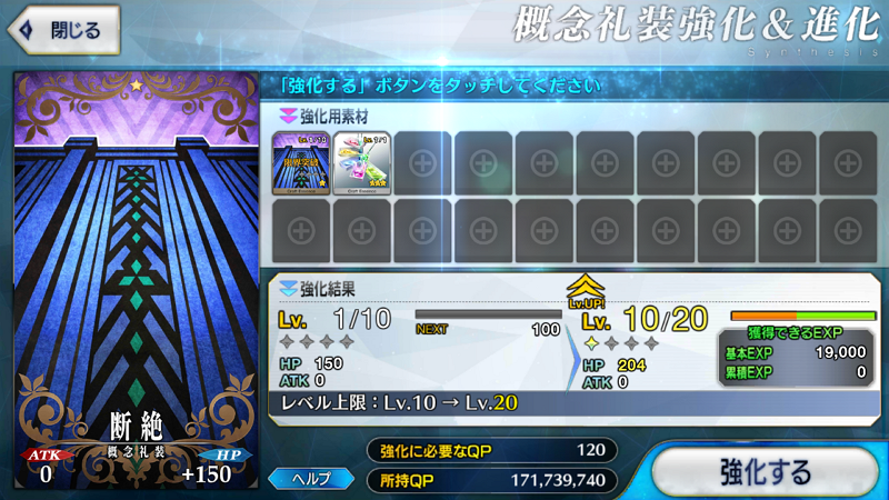 此搭配法總exp為19,000,消耗QP120,1QP相當於158經驗值。 - 經驗值禮裝搭配2:2張相同的★1禮裝+1張★4經驗值禮裝。